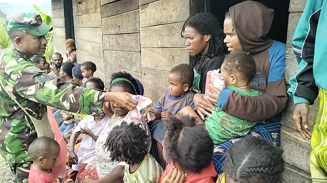Babinsa Koramil 1703-02/Tigi bersama Persit KCK Cabang XXXII saat membagikan bantuan makanan tambahan bergizi kepada anak-anak balita dan ibu hamil dalam rangka mencegah stunting di halaman Koperasi Unit Primer Harapan Baru, Tigi, Deiyai, Rabu (18/1). Kegiatan ini merupakan wujud nyata mendukung program Kepala Staf TNI Angkatan Darat terkait percepatan penurunan angka stunting. Foto: Istimewa