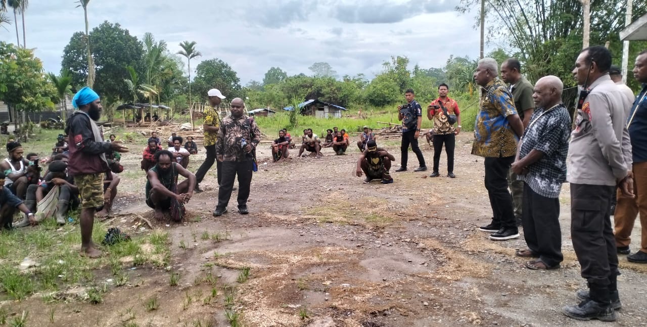 Bupati Kabupaten Mimika Johannes Rettob saat meninjau langsung keadaan di Distrik Kwamki Narama sekaligus memfasilitasi kedua kelompok warga yang bertikai menuju rekonsiliasi damai. Konflik meletus sejak Oktober 2025 hingga sebelas nyawa melayang. Foto: Istimewa