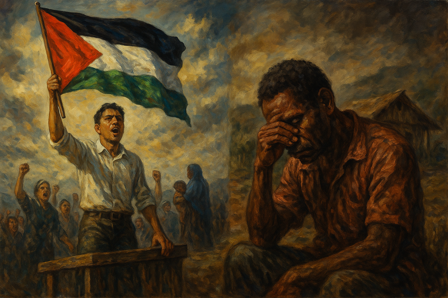 Ironisnya, suara rakyat Papua nyaris tak pernah mendapat panggung sebesar Palestina. Tak ada demo besar-besaran di jalanan untuk anak-anak Papua yang mati di hutan karena konflik. Tak ada doa massal di stadion untuk para pengungsi Papua. Tak ada orasi pejabat tinggi negara yang meneteskan air mata untuk penderitaan mereka.