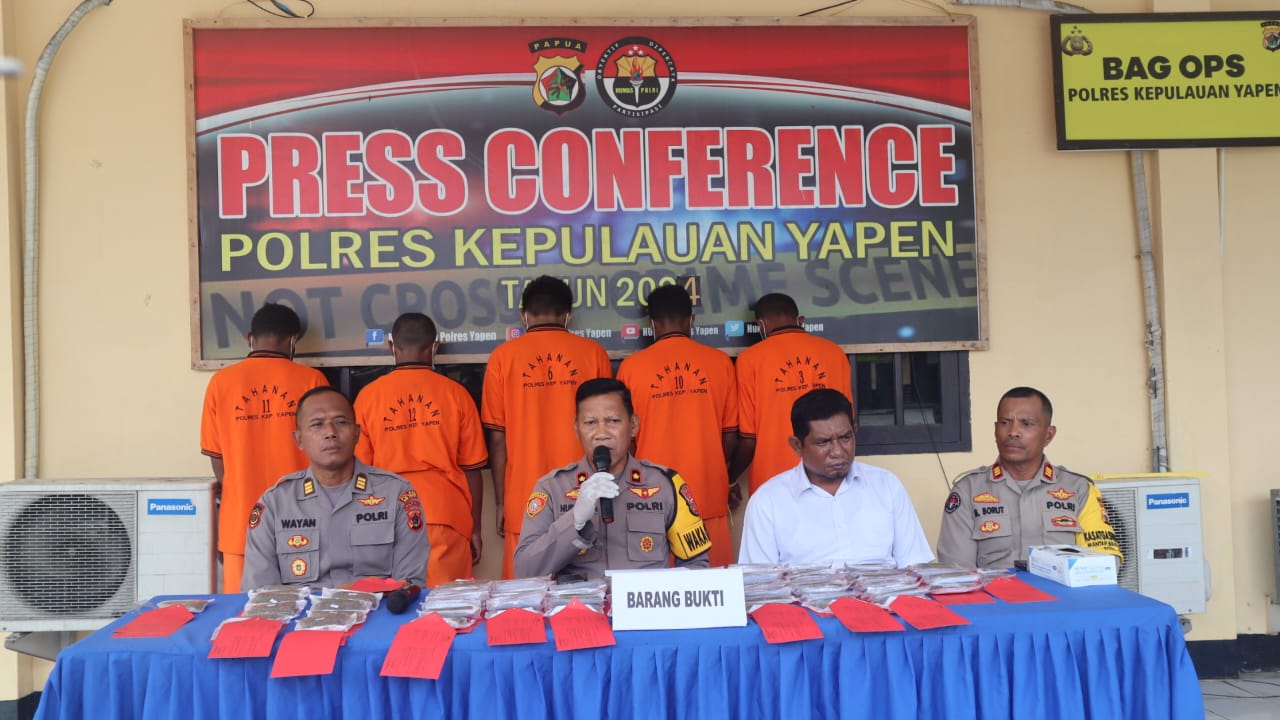 SERUI, ODIYAIWUU.com — Aparat Kepolisian Resor (Polres) Kepulauan Yapen, Kepolisian Daerah (Polda) Papua, berhasil mengungkap sindikat pengedaran narkotika dan obat-obat berbahaya (narkotika). Aparat juga berhasil membekuk lima tersangka yang diduga terlibat dalam kasus pengedaran ganja seberat 2.424,6 gram.