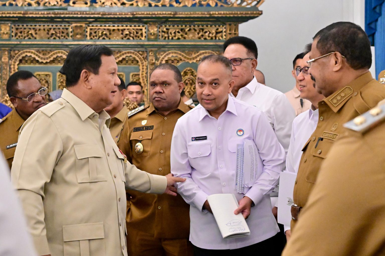 Ketua Komite Eksekutif Percepatan Pembangunan Otonomi Khusus Papua (KEPP-OKP) Dr Velix Vernando Wanggai, SIP, MPA (baju putih) dan anggota KEPP OKP) saat bertemu Presiden Republik Indonesia H. Prabowo Subianto (kiri) di Istana Negara, Jalan Veteran, Jakarta, Selasa (16/12). Foto: Istimewa