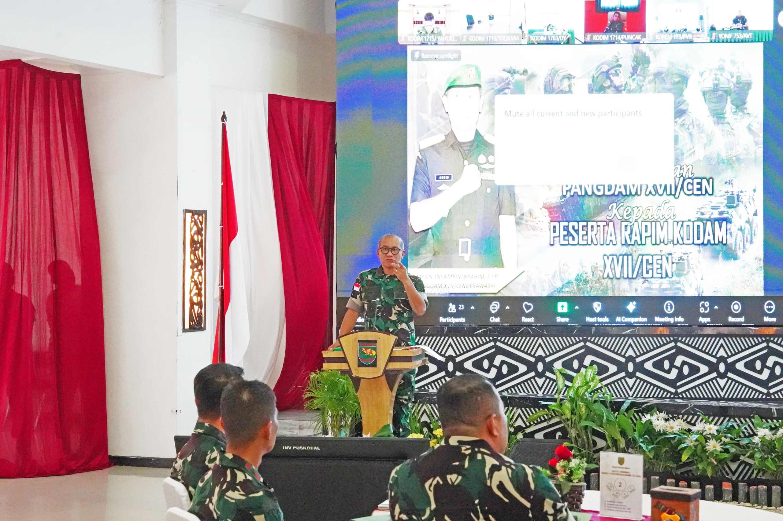 Panglima Kodam Cenderawasih Mayjen TNI Amrin Ibrahim, SIP memimpin langsung Rapim dan diikuti para Komandan Satuan jajaran Kodam Cenderawasih. Kegiatan itu merupakan tindak lanjut dari Rakornas dan Rapim TNI di Markas Besar TNI Cilangkap serta Rapim TNI AD di Mabes Angkatan Darat.