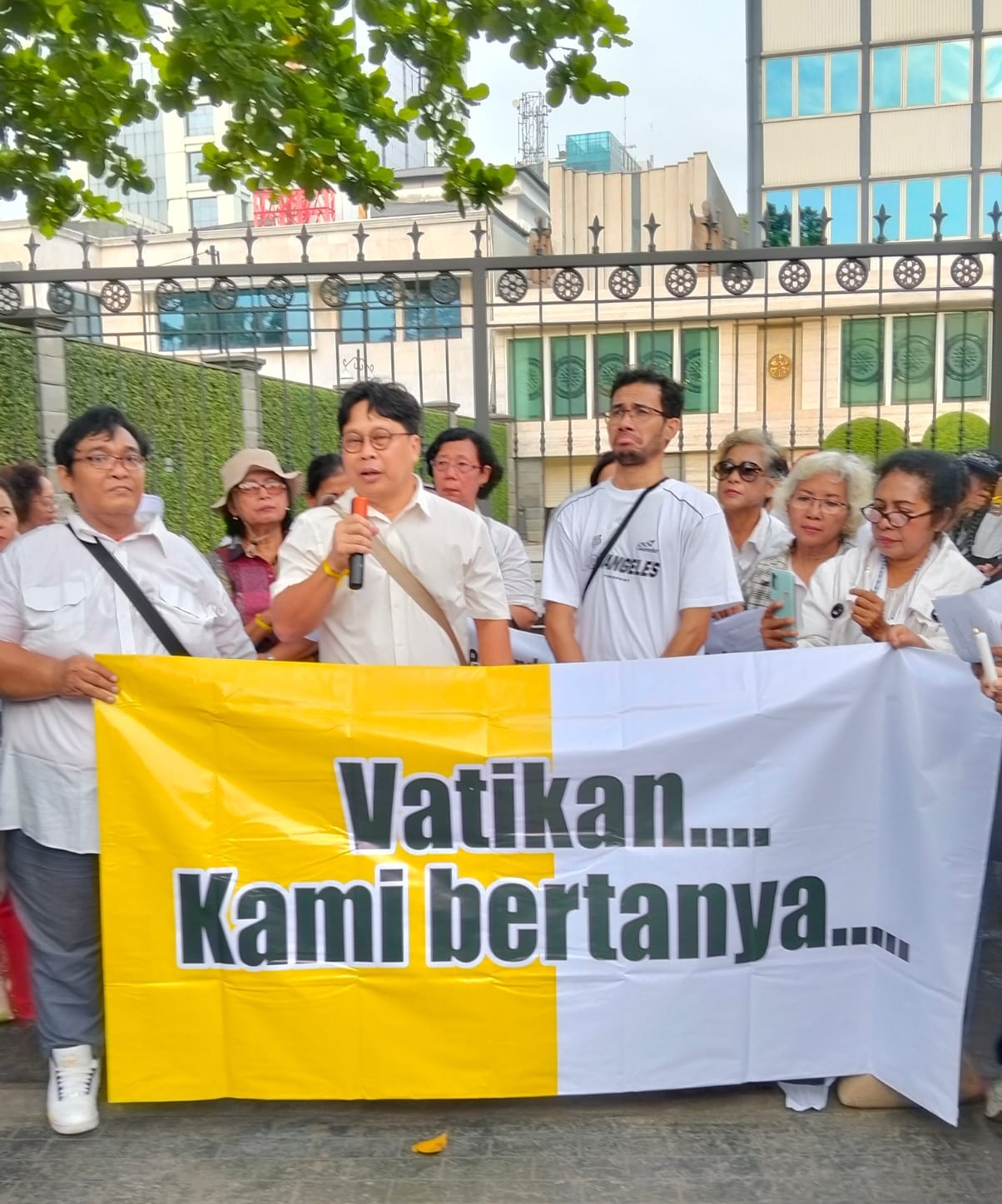 “Kejanggalan dan pertanyaan tersebut bukan hanya bagi kami umat Katolik Keuskupan Bogor, melainkan juga bagi umat Katolik di seluruh Indonesia,” ujar Dr Yustinus Prastowo dari Solidaritas Umat untuk Mgr Paskalis Bruno Syukur, OFM usai aksi di depan Nunciatura Apostolik, Jalan Medan Merdeka Timur, Jakarta Pusat, Selasa (10/2).