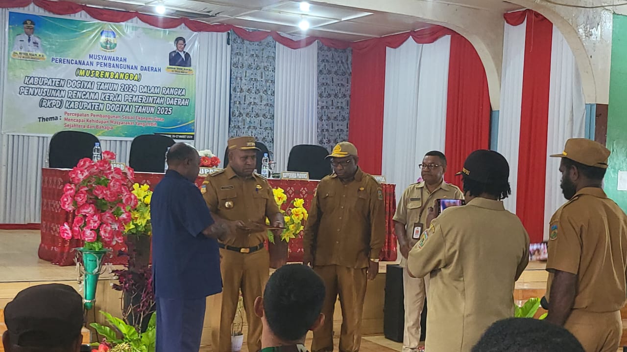 Penjabat Bupati Dogiyai Drs Petrus Agapa, M.Si saat membuka Musrenbang mengatakan, Musrenbang Dogiyai tahun 2024 merupakan wadah strategis yang melibatkan pimpinan organisasi perangkat daerah (OPD) dan semua pemangku kepentingan (stakeholder) untuk merumuskan dan menyusun RKPD berdasarkan hasil Musrenbang kecamatan, pokok pikiran DPRD Dogiyai, rancangan kerja (renja) perangkat daerah, dan hasil forum gabungan perangkat daerah.