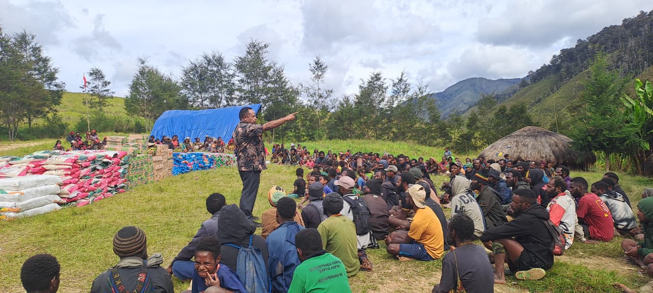 LANNY JAYA, ODIYAIWUU.com — Pemerintah Provinsi Papua Pegunungan menyalurkan bantuan beras sebanyak 2 ton bagi pengungsi di Kampung Malagai, Kabupaten Lanny Jaya, Kamis (9/10). Bantuan tersebut diserahkan langsung Kepala Dinas Sosial, Pemberdayaan Perempuan dan Anak Papua Pegunungan Yanius Telenggen, SH, MAP.