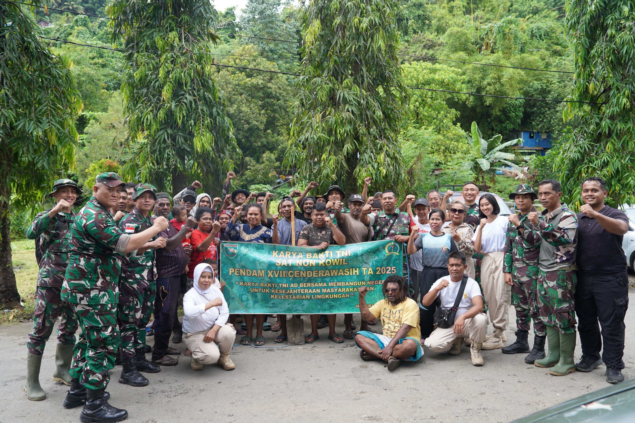 Satuan Penerangan Komando Daerah Militer (Kodam) XVII/Cenderawasih bersama masyarakat di sela-sela karya bakti TNI satuan non kewilayahan di eks Pasar Ampera, Kelurahan Gurabesi, Distrik Jayapura Utara, Kota Jayapura, Papua, Rabu (30/7). Foto: Istimewa