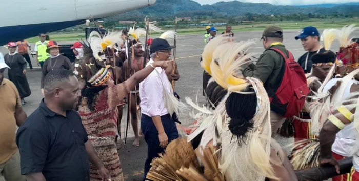 Sekjen KWI Mgr Paskalis Bruno Syukur, OFM disambut hangat saat tiba di Bandara Oksibil, Kabupaten Pegunungan Bintang, Provinsi Papua Pegunungan, Selasa (21/10). Kehadiran Mgr Paskalis untuk menghadiri Perayaan 100 Tahun Kongregasi Suster Fransiskan Santa Lusia (KSFL) di Indonesia. Foto: Istimewa